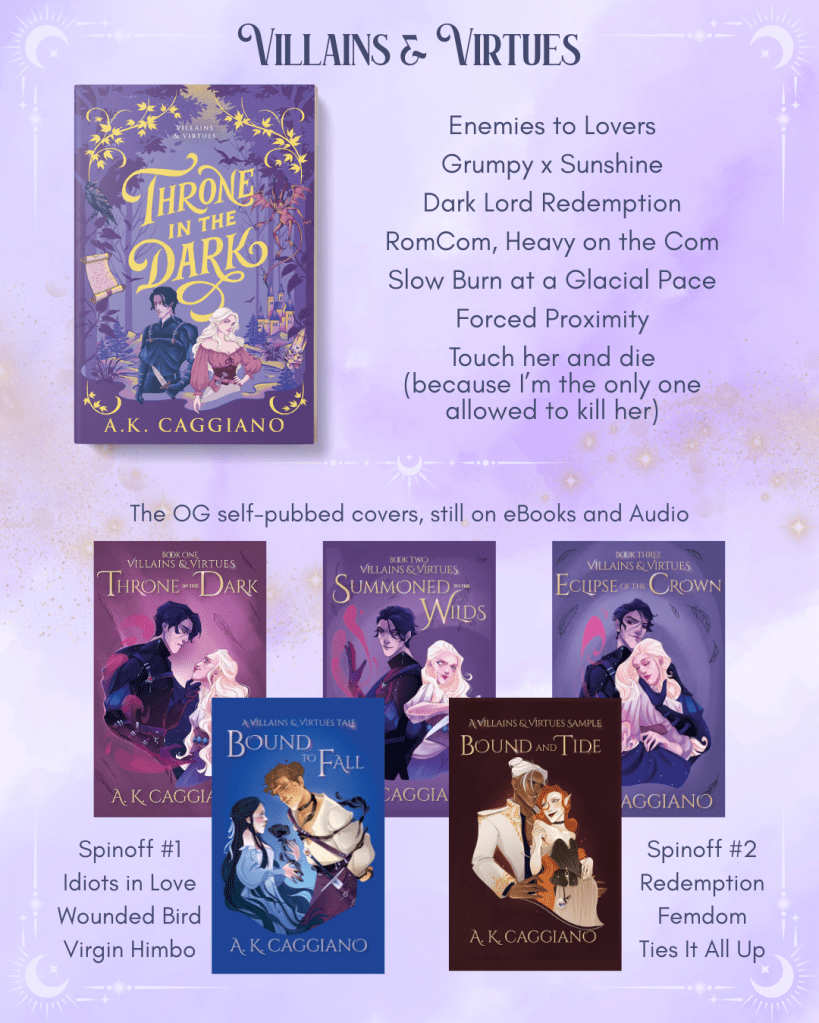 Villains & Virtues has been picked up by a traditional publisher and the paperbacks will be rereleased starting November 4th, 2025 with Throne in the Dark.