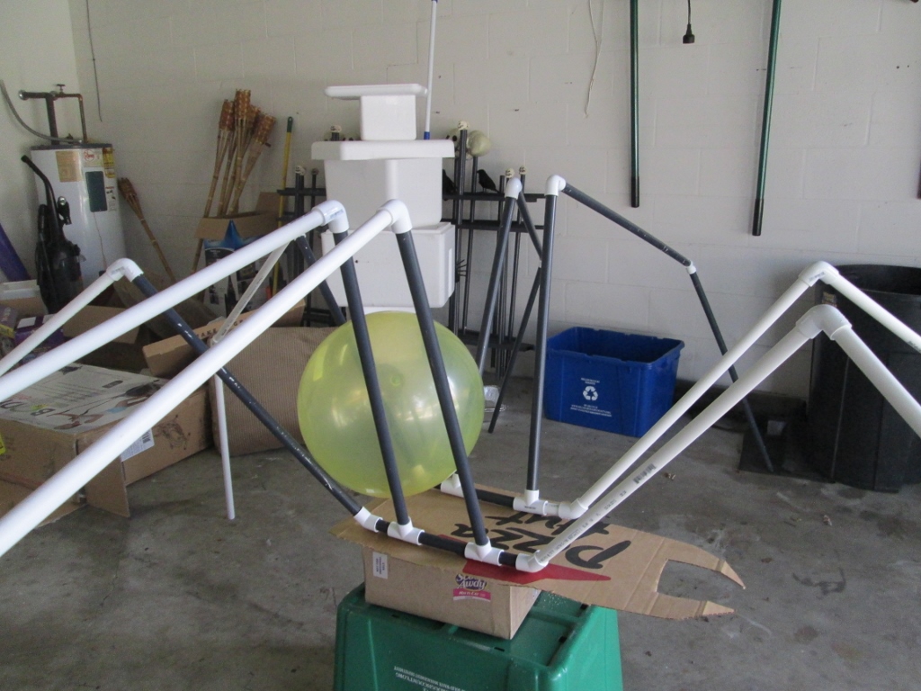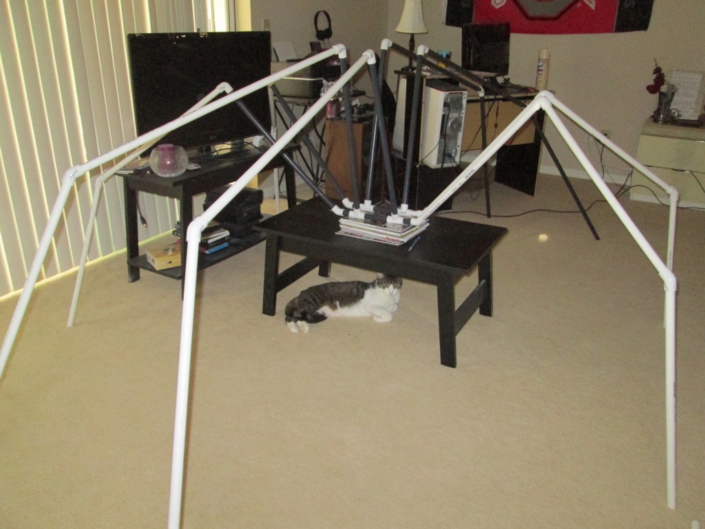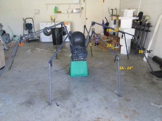 All the pipes sticking up from the body bit I’m calling 1s. The 1s for all eight legs are all 24 inches long in my version. Between all 1s and 2s (the second leg segment) are all 90° connectors. Okay, the most confusing part is coming up (luckily no part of this is really confusing so, you’re welcome). Each leg is made up of three segments. The two front and two back legs are 1, 2A, and 3A. All of these segments are 24 inches. The middle legs are 1, 2B, and 3B. Segment 1 is still 24″ but 2B and 3B are 36 inches. Got it? Okay, great. I knew you would. Oh, and segment 2 and 3, no matter what length they are, are connected by a 45° connector.