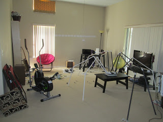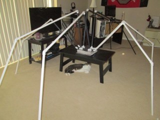 My suggestion would be to not construct this inside, for obvious reasons. Since I knew I’d want to play with the size and it wouldn’t be just a simple slap it all together thing, and it’s like a billion degrees outside, I did it in my living room. Had a couple other projects going on at the time too, so the place is messier than usual. When I transported it to the garage it fell apart completely (fitting through door frames and the like) and my neighbors heard their fair share of curses that day.
