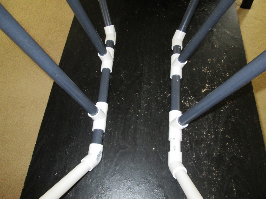 You want to start out with your base to keep your legs together (not metaphorically speaking, do whatever you’d like with your legs!). I had some painted PVC leftover from last year’s fence, and I have to say that cutting that pre-painted shit was a nightmare. Cutting clean, new PVC, though, was much better. I eyeballed these pieces, so I can’t really tell you the length of them, you just want both sides somewhat symmetrical. Or not, it’s your thing, after all. The front and back legs will bend away from the main body, so those connecting pieces can be much shorter than the middle legs which will be pretty similar, so they need some space. Connect your front legs with 45° thingies and the middle ones with your tee thingies. (Note: try to not call them “thingies” at the hardware store. You will get more respect and better help from the seasoned old men in the red vests if you use their official-type name.)