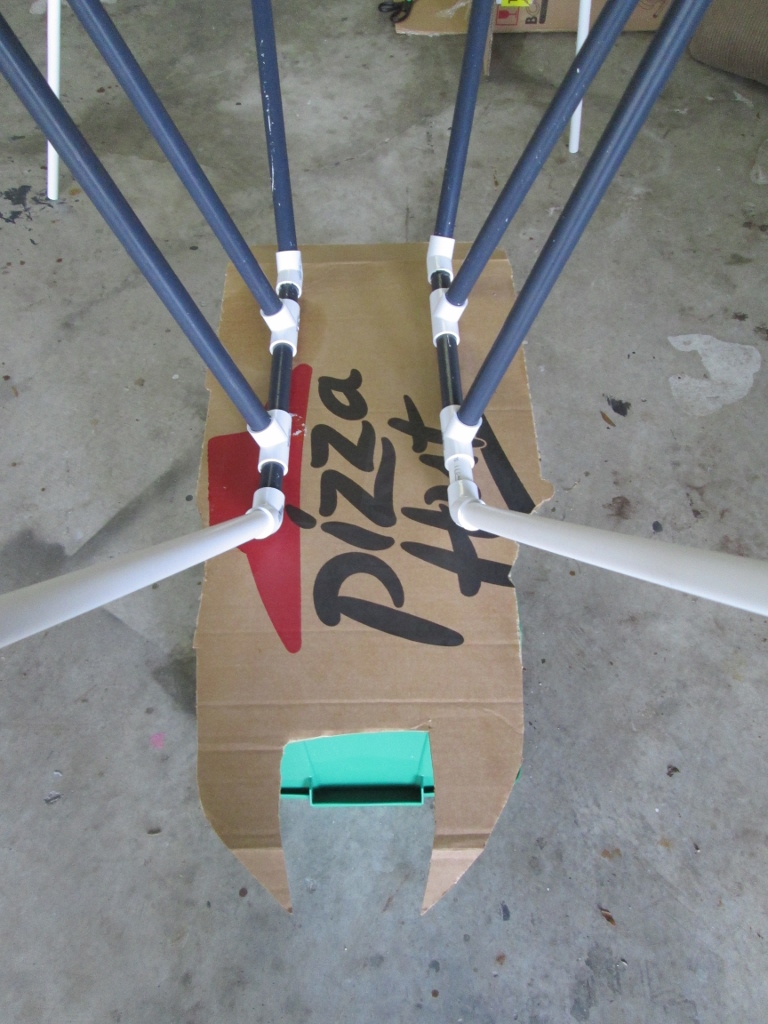 Once outside I propped it up again, being sure to get it up to the same height I had inside (putting the body at about 19 inches off the ground), and I grabbed a pizza hut box cover, cutting out the basic body and pincer shape I wanted.