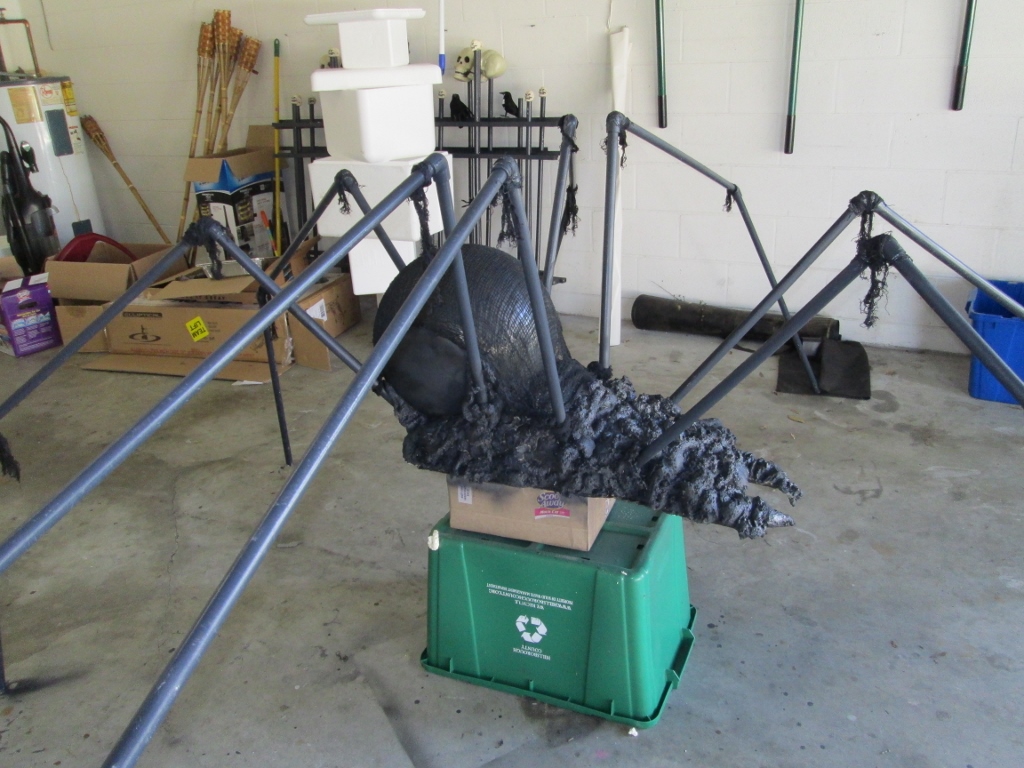 So then basically I spray painted him black. Spray painting PVC is kinda a pain, so I partially sprayed, partially used some old charcoal-grey paint and brushes from last year to do the legs. I liked painting over the netting because it helps it stick to the body and it gives it more depth. You can see some of that sickening yellow peaking through, and I like that too. I considered using these little skulls I had for eyes, doing about six or eight of them on the head, but it didn’t look right. For now I am forgoing eyes, and if I find something I like I’ll add them, but he will most likely stay like that. I went a little bonkers from the spray paint and played around with some metallic grey stuff too for fun. You can’t really tell, but he looks kind of wet which is creepy. He got a layer of clear coat to protect him from the rain too, of course.