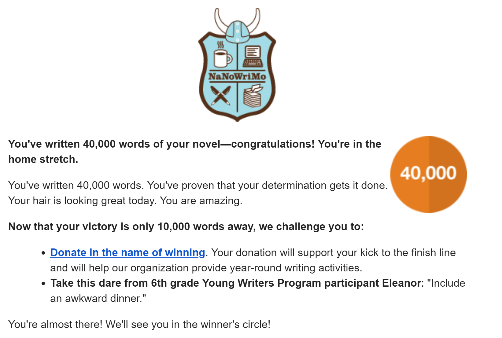 This is the letter you get at 40,000 words. It’s incredibly encouraging, for me at least. What’s especially funny though: I dyed my hair purple today for the first time in like four-ish months and the next scene I’m about the embark on literally is an awkward dinner.
