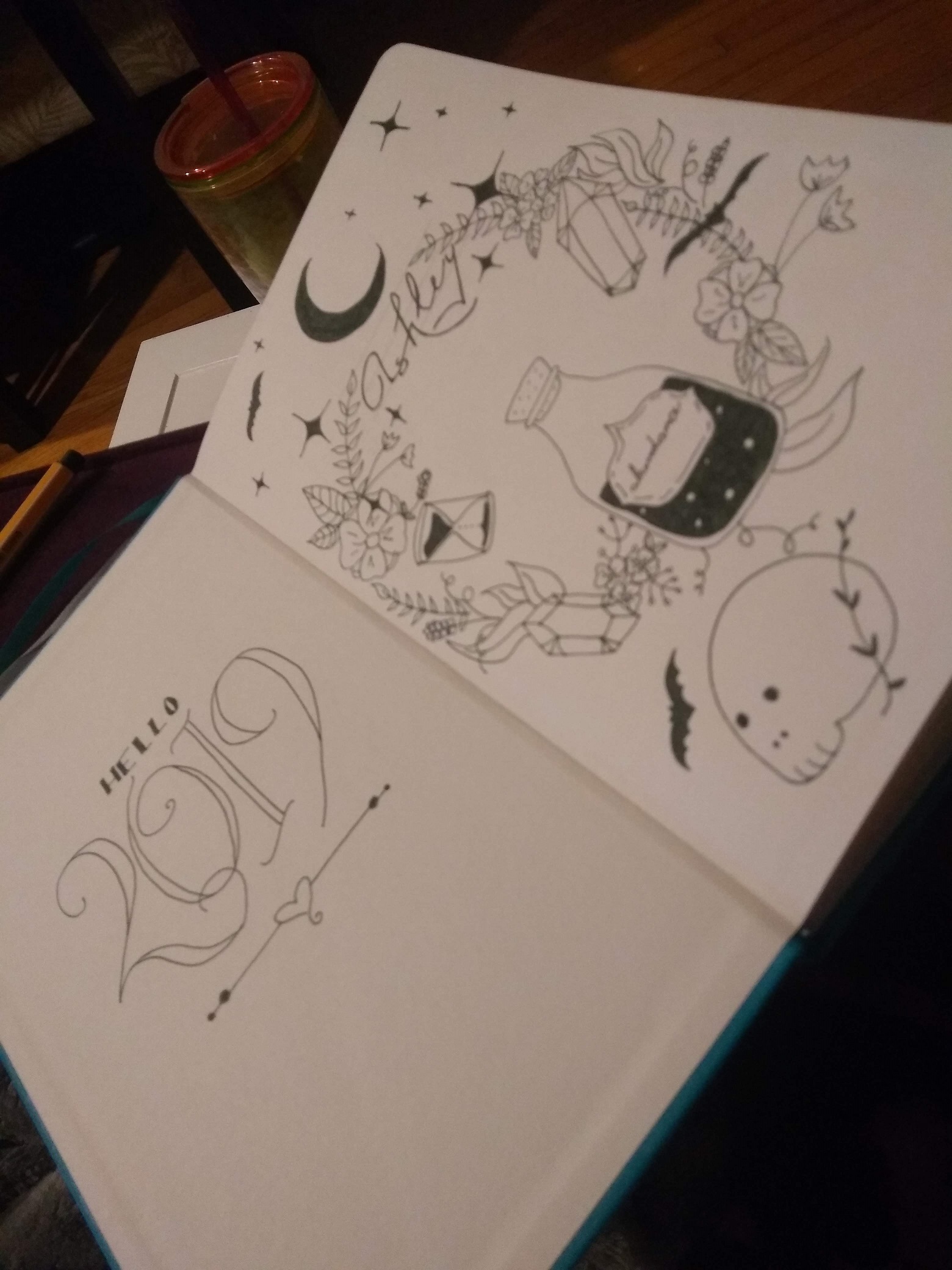 This year, I’m getting more organized, which is something I say every year, but this year I bought something I’ve been kinda pining after for a while: a bullet journal. But let me be absolutely clear: I do not intend on doing the whole like key for tasks thing, moving them forward and backward and basically any of the actual bullet things. I just want a pretty notebook that I draw calendars and doodles in. And look at the start I’ve gotten to: