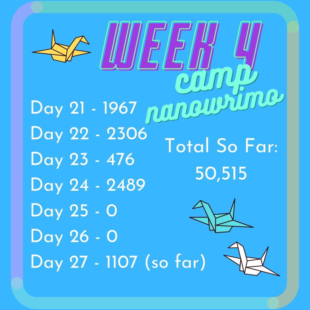 Still, I’m aiming for another 10k by the month’s end, and I’m fairly certain I can do it. There’s four whole days left! (And the rest of today!) I’d also like to plot out the novella I’ve been thinking about over the next couple days so that if I can fit it into August with The Association revision and my niece’s visit, I’ll be ready to hit the page writing.