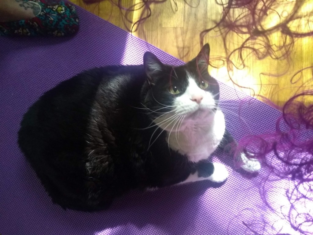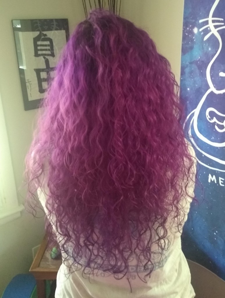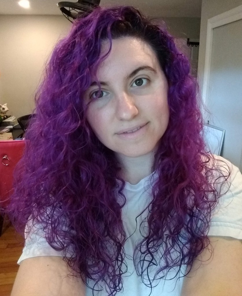 I’m purple again! I like playing with other colors, but I’m meant to be purple–luckily it compliments my skin the best of all the “unnatural” colors since it’s my favorite (not that I ever let my patchy red skin ever stop me from being pink!) I’m also embracing my natural texture which is often a pain, but sometimes it pays off. I’m working up to Jessie from Saved By The Bell.