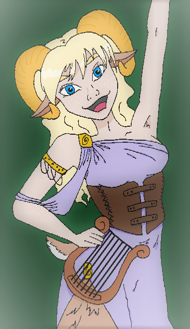 Emi Bounder was born into the Dionion clan of satyrs in the Methwood (yeah, this is a place on the map). She grew up carefree and inquisitive and frequently “ran away” to Heptios on the Bay of Chessenta for excitement but always returned. She opted to focus on the more frivolous skills of music, painting, and theatre, though that was typical of her kind.
