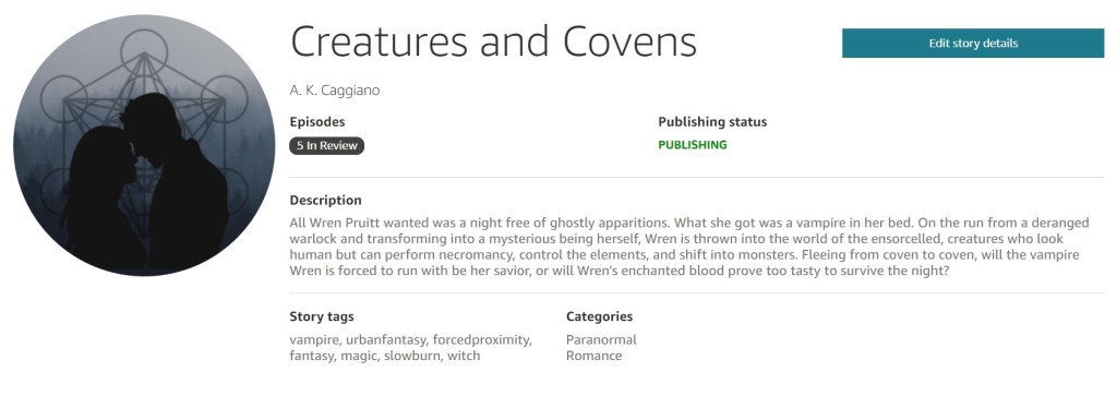 The Amazonians have made the announcement–Kindle Vella goes live “next week” (because giving us an exact date would be way too helpful), so I’ve taken the plunge and have the first five episodes of my super-secret-except-not-really, paranormal romance Creatures and Covens uploaded and in review!