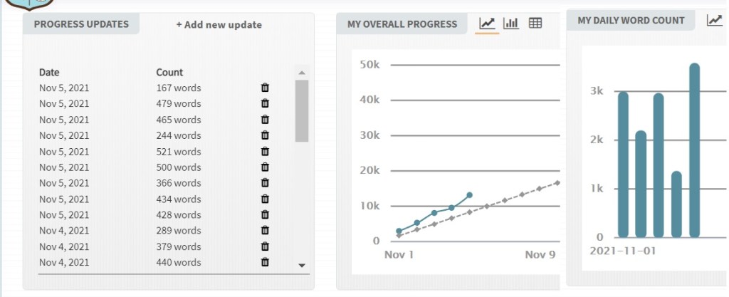 I’m pleased with my progress, sitting very comfortably at 13,183 total new words for the month so far. That’s just about three days ahead of schedule, and right now I’m in the early act two bits. I already had about 17k written that took me through act one.