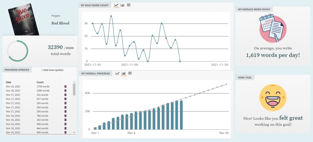 Today’s words haven’t been recorded or even finished yet, but as of 11/19 I’m at 32,390, and I should be at 31,673, so I’m riiiight there, just keeping myself ahead, a true testament to front loading.