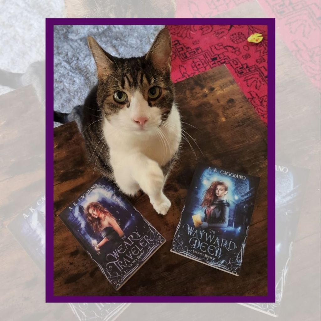 Di was gracious enough to do a little photoshoot with my copies. I was so wrapped up in how cute he is, that the books didn’t come out looking great in the photos, but I know you know what a book looks like, Dear Reader, so enjoy the cat.