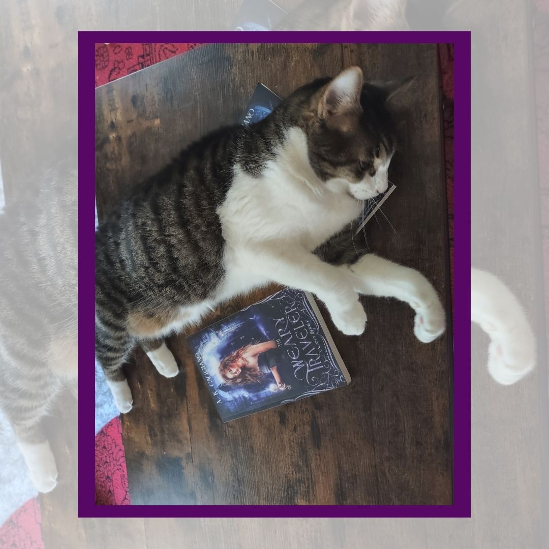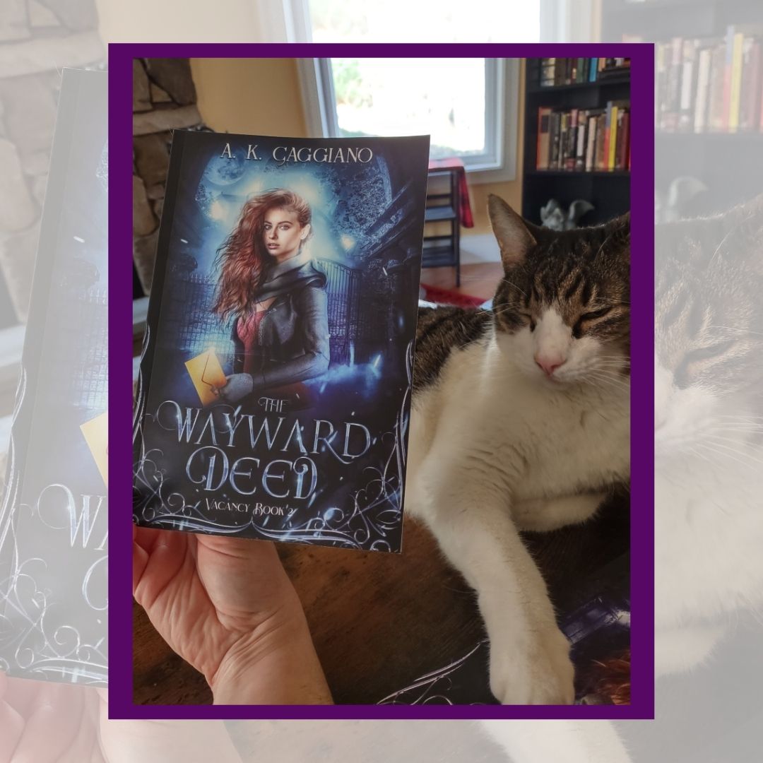 Di was gracious enough to do a little photoshoot with my copies. I was so wrapped up in how cute he is, that the books didn’t come out looking great in the photos, but I know you know what a book looks like, Dear Reader, so enjoy the cat.