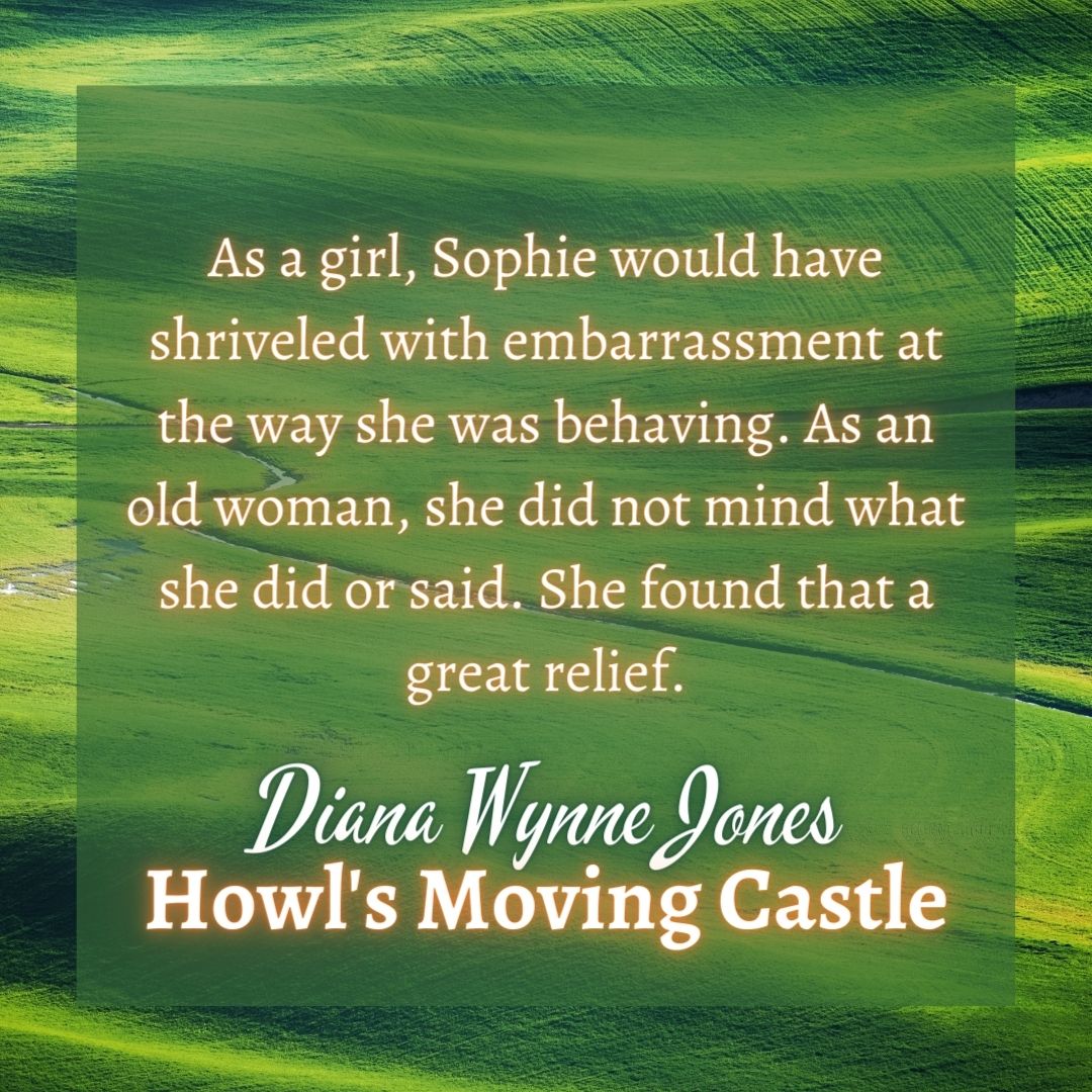 My view on these lines from Howl’s Moving Castle are steeped in an overall feminist reading (sorry, not sorry, can’t help it). This could just be about aging in general, sure, and I’d hope that anyone reading the book could take away something positive from this, but as a woman I find that many of the behaviors I exhibited when I was younger (and still plenty today) were weighed down heavily by gendered expectations. Sophie and Howl’s relationship isn’t ideally egalitarian, but the book’s a fantasy, and we often have to put aside our real-life experiences to enjoy escapism, right?