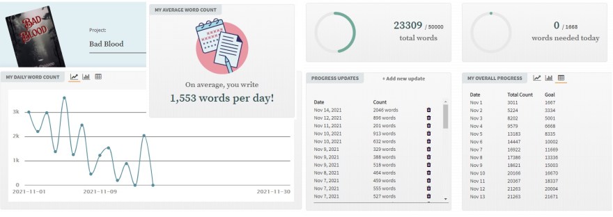I don't know that it's fair to call this a slump as I was impossibly busy last week, but my word count did drop dramatically. I am, however, still on target thanks to a banner week one! So, I missed the 13th, ruining my streak which is a huge personal bummer, but I was exhausted… Continue reading NaNoWriMo 2021: The Second Week Slump